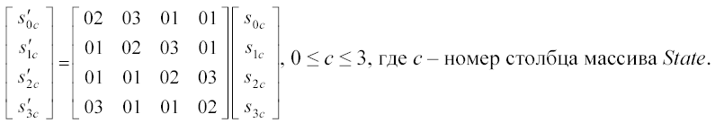 Четыре байта в каждом столбце состояния представляют собой 32-битное слово, если г - номер строки в состоянии, то одновременно он является индексом каждого байта в этом слове. Следовательно состояние можно представить как одномерный массив 32-битных слов wo,...,wN , где номер столбца состояния с есть индекс в этом массиве. Тогда состояние можно представить так: