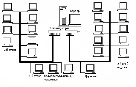 Каждая организация формулирует собственные требования к конфигурации сети, определяемые характером решаемых задач. В первую очередь необходимо определить, сколько человек будут работать в сети. От этого решения, по существу, будут зависеть все последующие этапы создания сети. Количество рабочих станций напрямую зависит от предполагаемого числа сотрудников. Другим фактором является иерархия компании. Для фирмы с горизонтальной структурой, где все сотрудники должны иметь доступ к данным друг друга, оптимальным решением является простая одноранговая сеть. Фирме, построенной по принципу вертикальной структуры, в которой точно известно, какой сотрудник и к какой информации должен иметь доступ, следует ориентироваться на более дорогой вариант сети – с выделенным сервером. Только в такой сети существует возможность администрирования прав доступа. В данном случае на предприятии имеется 30 рабочих станции, которые и требуется объединить в корпоративную сеть. Причем они объединены в следующие группы: