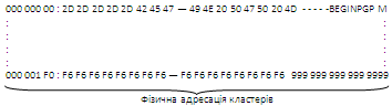 В області даних сектори називаються – кластерами. Нумерація кластерів починається з 2-го, який відповідає 33-му сектору, а останній має номер 2848 і відповідає 2879 секторові.