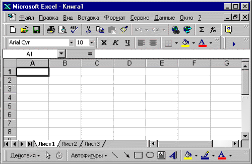 Рабочее окно Excel содержит стандартную строку заголовка, меню и панели инструментов. Под ними расположена панель, в составе которой имеются поле имени и строка формул.