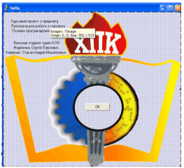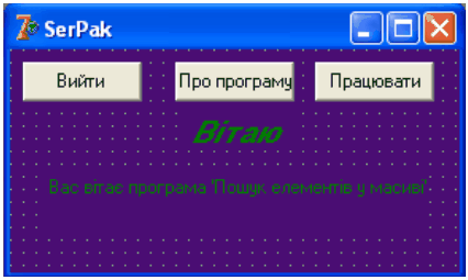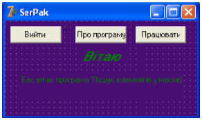 При запуску програми відображається форма, що зображена на рис. 10, при натисканні на ту чи іншу кнопку виконуються певні дії. При натисканні на кнопку ‘Вийти’ користувач покидає програму. При натисканні на кнопку ‘Про програму’ відкривається вікно, у якому міститься коротка інформація про даний програмний продукт і міститься електронна адреса виробника. При натисканні на кнопку ‘Працювати’ відкривається головна форма на якій виконується практично уся робота.
