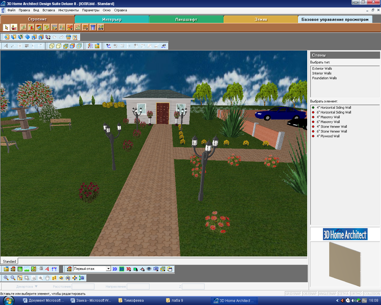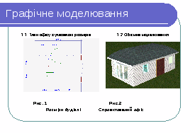 У графічному моделюванні був розроблен план офісу, ведучий у сфері ремонту ЕОМ. План офісу розроблявся виходячи з кількості працівників та устаткування (3 комп’ютери, 2 принтера, 2 сканера, модем, 1 блоку безперебійного живлення, осцилограф, музичний цент). На плані показані меблі, комп’ютери, електротехнічна арматура(світильники, розетки, вимикачі), вікна, двері. Був розроблен дизайн офісу, а також ландшафт(газони, доріжки, під’їзд для автомобілів). План офісу займає 25 м2.