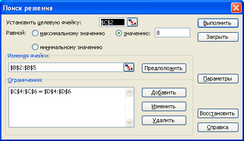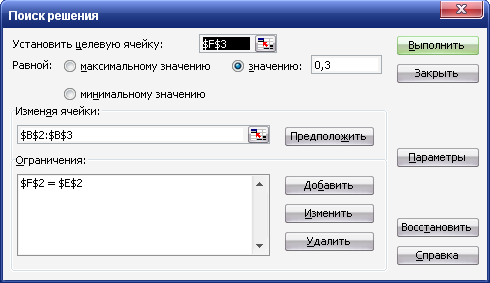 При клацанні на ОК програма підбирає параметр для комірки зі змінною перемінною, щоб значення цільової функції дорівнювалося нулю.