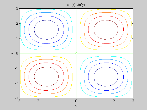 >> ezcontour (sin(x)*sin(y), [-3,3], 50)