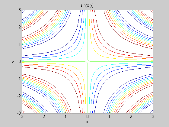 >> ezcontour (sin(x*y), [-3,3], 30)