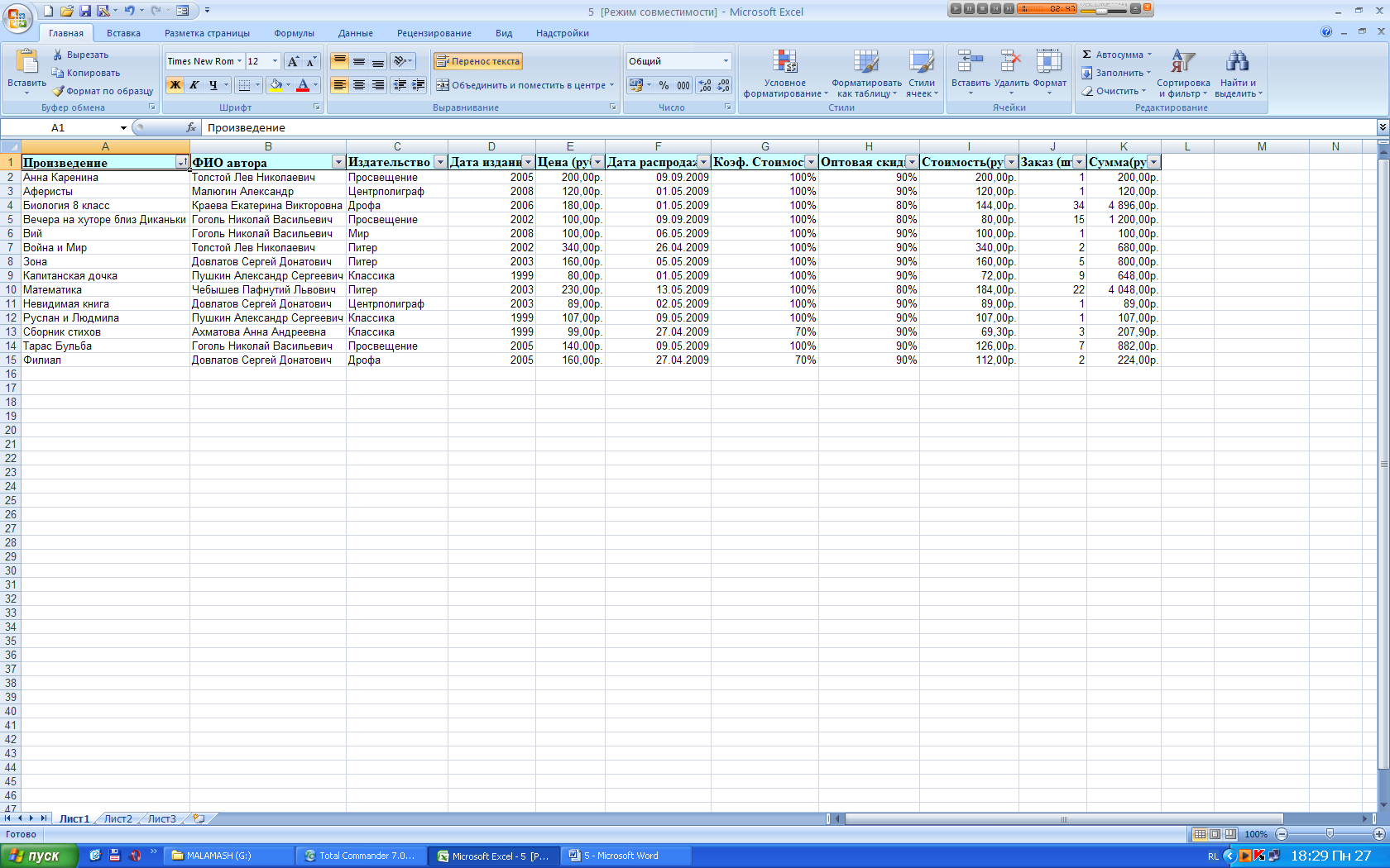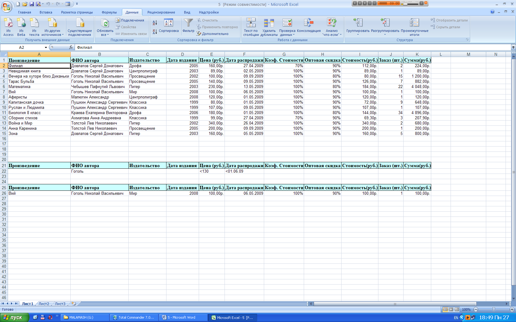 Используя команду меню ДАННЫЕ=>СОРТИРОВКА, можно отсортировать список за один прием максимум по трем полям (первичный индекс, вторичный индекс и т.д.). В случае необходимости можно произвести сортировку и более чем по трем столбцам. В этой ситуации список сортируется последовательно, начиная с наименее важного поля.