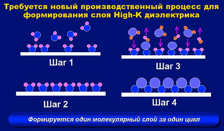 Если проницаемость объемного диоксида кремния равна 4 (или чуть меньше в сверхтонких слоях), то разумной величиной диэлектрической проницаемости нового "интеловского" диэлектрика можно считать величину в районе 10-12. Несмотря на то, что материалов с такой диэлектрической проницаемостью немало (конденсаторные керамики или монокристалл кремния), тут не менее важны факторы технологической совместимости материалов. Поэтому для нового high-k-материала был разработан свой высокоточный процесс нанесения представленный на рисунке 5, во время которого формируется один молекулярный слой этого материала за один цикл.