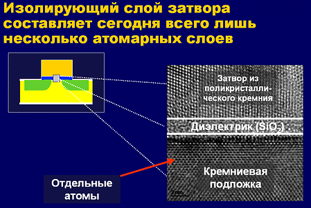Здесь пора вспомнить структуру транзистора, а именно - тонкий слой диоксида кремния, изолятора, находящегося между затвором и каналом, и выполняющего вполне понятную функцию - барьера для электронов, предотвращающего утечку тока затвора. Очевидно, что чем толще этот слой, тем лучше он выполняет свои изоляционные функции, но он является составной частью канала, и не менее очевидно, что если мы собираемся уменьшать длину канала (размер транзистора), то нам надо уменьшать его толщину, причем, весьма быстрыми темпами. К слову говоря, за последние несколько десятилетий толщина этого слоя составляет в среднем порядка 1/45 от всей длины канала. Но у этого процесса есть свой конец - как утверждал пять лет назад все тот же Intel, при продолжении использования SiO2, как это было на протяжении последних 30 лет, минимальная толщина слоя будет составлять 2.3. нм, иначе ток утечка тока затвора приобретет просто нереальные величины.