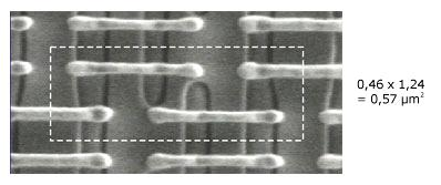 В первом (n-MOS) канал транзистора (n-канал) проводит ток при помощи электронов (отрицательно заряженных частиц), а во втором (p-MOS) - при помощи дырок (условно положительно заряженных частиц). Соответственно, и механизмы формирования напряженного кремния у этих двух случаев различны. Для n-MOS-транзистора используется внешнее покрытие слоем нитрида кремния (Si3N4), который за счет механических напряжений немного (на доли процента) растягивает (в направлении протекания тока) кристаллическую решетку кремния под затвором, в результате чего рабочий ток канала возрастает на 10% (условно говоря, электронам становится более просторно двигаться в направлении канала). В p-MOS-транзисторах все наоборот: в качестве материала подложки (точнее - только областей стока и истока) используется соединение кремния с германием (SiGe), что немного сжимает кристаллическую решетку кремния под затвором в направлении канала. Поэтому дыркам становится "легче" "передвигаться" сквозь акцепторные атомы примеси, и рабочий ток канала возрастает на 25%. Сочетание же обеих технологий дает 20-30-процентное усиление тока. Таким образом, применение технологии "напряженного кремния" в обоих типах устройств (n-MOS и p-MOS) приводит к значительному повышению производительности транзисторов при повышении себестоимости их производства всего лишь на ~2% и позволяет создавать более миниатюрные транзисторы следующих поколений. В планах Intel - использовать напряженный кремний для всех будущих техпроцессов вплоть до 22-нанометрового.6-транзисторная ячейка памяти представлена на рисунке 8.