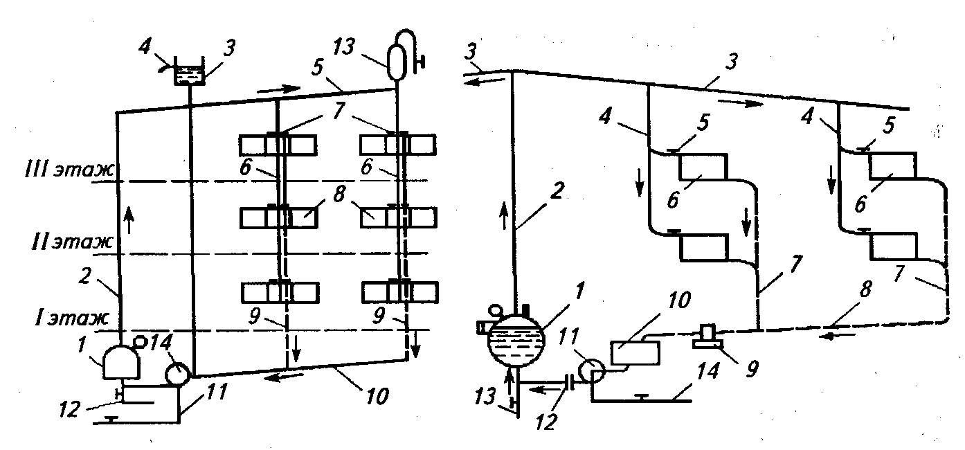 Рис. 11. Схема системы центрального водяного отопления с искусственным побуждением: / — котел; 2— главный горячий стояк; 3— расширительный сосуд; 4 — сливная труба; 5—водяная магистраль; б—горячие стояки; 7—вентили; 8— приборы отопления; 9 — стояки охлажденной воды; 10 — обратная магистраль; 11 — центральный водопровод; 12— канализация; 13— воздухосборник; 14— насос |