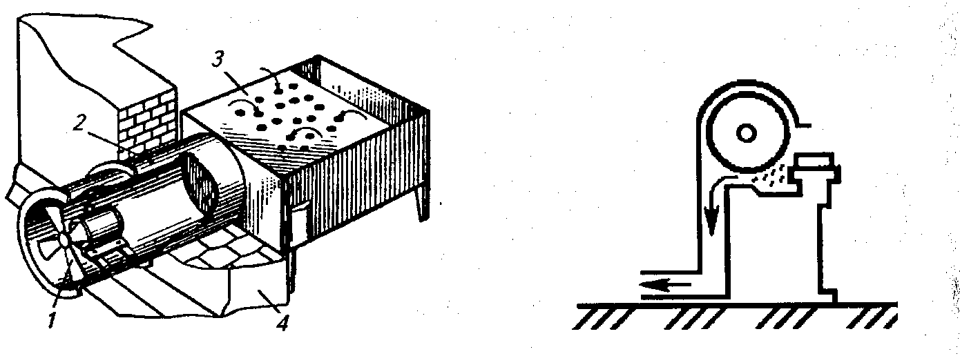 Рис. 8. Вытяжная вентиляция на рабочем месте сварщика: 1 — вентилятор; 2 — вытяжная труба; 3 — стол сварщика; 4 — стена |