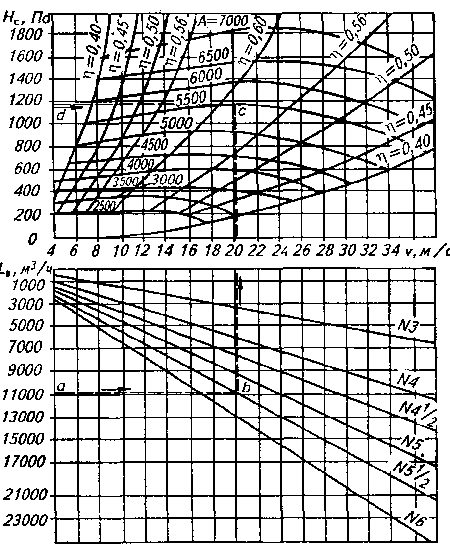 где D — диаметр рабочего колеса вентилятора, м; n —частота вращения вентилятора, мин-1: n = A/(60N); А — безразмерный параметр, определяемый по номограммам при выборе вентилятора; N— номер вентилятора (диаметр его рабочего колеса в дециметрах).