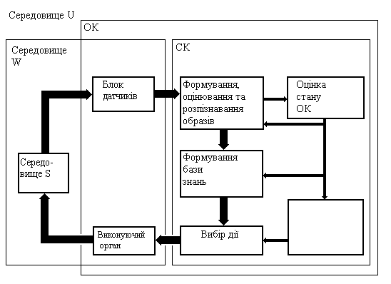 На рис.5 подана система, під якою будемо розуміти середовище, у яке вкладений ОК, що містить у свою чергу КС. Як бачимо з малюнку, можна стверджувати, що КС управляє не тільки ОК, але й всією системою. Під середовищем у системі можна розуміти різні об'єднання об'єктів. Будемо називати середовищем W сукупність об'єктів, що лежать поза КС; середовищем S - сукупність об'єктів, що лежать поза ОК; середовищем U - всю систему.5