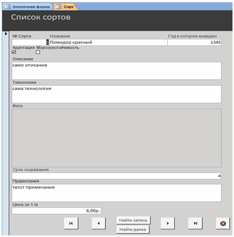 Выбрав пункт меню «Список сортов» отроется форма для ввода информации о сорте.