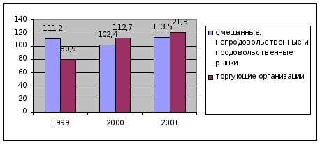 В настоящее время объем розничного товарооборота формируется практически полностью за счет негосударственного сектора (торговые предприятия негосударственных форм собственности, супермаркеты). В 2001 году его оборот достиг 719,2 млрд.тенге (99,5%), тогда как в 1991 году он составлял всего лишь 35,3%.В Казахстане до 1994 года включительно наблюдался спад объемов реализации товаров, в то же время существенно наращивались стоимостные объемы в связи с высоким уровнем инфляции в эти годы. В последующие годы состояние потребительского рынка республики характеризуется достаточно высоким и устойчивым обеспечением товарами, что в определенной мере позволяет сохранять тенденцию роста реальных объемов розничного товарооборота. В последнее время, наряду с торговлей на рынках развивается и торговля в магазинах (супермаркетах), население республики все больше обращается за покупками товаров в магазины (супермаркеты), что обуславливает стабилизацию продажи их торгующими организациями, а соответственно и более высокий рост по сравнению с продажей товаров на рынках (рисунок 1).