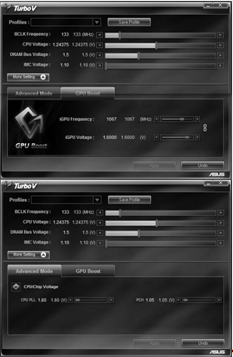 А также многофункциональную утилиту TurboV EVO, которая, помимо разгона процессора и памяти, позволяет разгонять и встроенное графическое ядро: