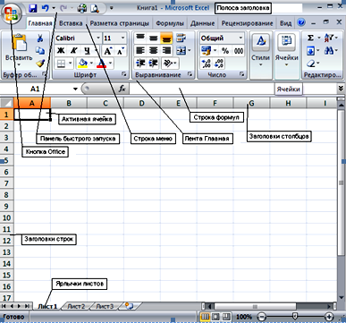 Как видно на рис. 1, при работе с электронной таблицей на экран выводятся рабочее поле таблицы и панель управления. Панель управления обычно включает: Главное меню, вспомогательную область управления, строку ввода и строку подсказки. Расположение этих областей на экране может быть произвольным и зависит от особенностей конкретного табличного процессора.