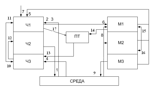 На рис. 1 представлена структурная схема «Ч–М–С». На ней указаны внешние связи: управляющее воздействие вышестоящей системы, воздействие машины на предмет труда, а также внутренние связи, указанные в таблице 1.