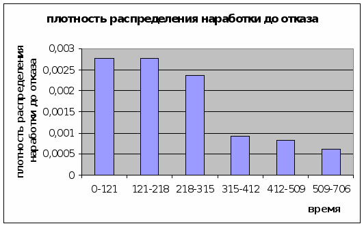 Отсюда следует, что для первого набора исходных данных средняя наработка до первого отказа приближенно равна T>1>=362 часа, а для второго набора средняя наработка на отказ равна T>2> = 95 часов. В первом случае распределение времени работы элемента между отказами явно отличается от экспоненциального, т. к. стандартное отклонение s>1>= 237 существенно отличается от средней наработки на отказ. Во втором случае стандартное отклонение s>2 >=91 достаточно близко к средней наработке до отказа, что свидетельствует о возможной близости распределения к экспоненциальному.