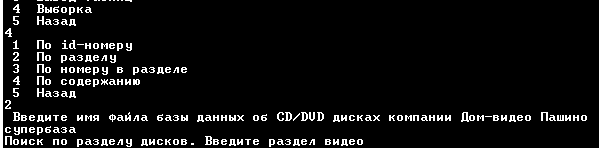 Теперь в меню Работа с созданной базой выбираем пункт Выборка. В нем предложены четыре критерия по которым можно осуществить выбор. Выберем, например, по разделу. Программа запросит имя файла базы данных о дисках. Вводим раздел видео: