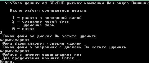 Осталось проверить удаление. Для этого в главном меню выберем пункт Удаление базы. Программа запросит имя файла базы данных о дисках, который нужно удалить. Вводим Барыгамаркет. Программа пишет: «фаил Барыгамаркет успешно удален». Потом программа запросит имя файла базы данных о тех. состоянии автобусов, который нужно удалить. Вводим Барыгамаркет. Программа пишет, что фаил Барыгамаркет уже удален.