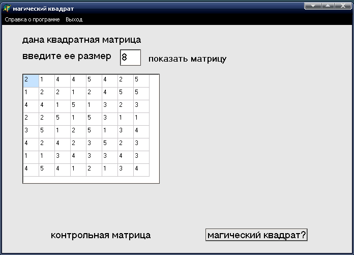 Программа запускается нажатием на файл Magi.exe. На открывающем окне формы расположен меню MainMenu, через которого можно открыть справки, помощь и закрыть программу. Ввод данных осуществляется с помощью случайных чисел. Нажатие на метку Показать вызывает процедуры формирования матрицы. Элементы матрицы и контрольной матрицы загружаются для отображения на форме в компонент StringGrid1.