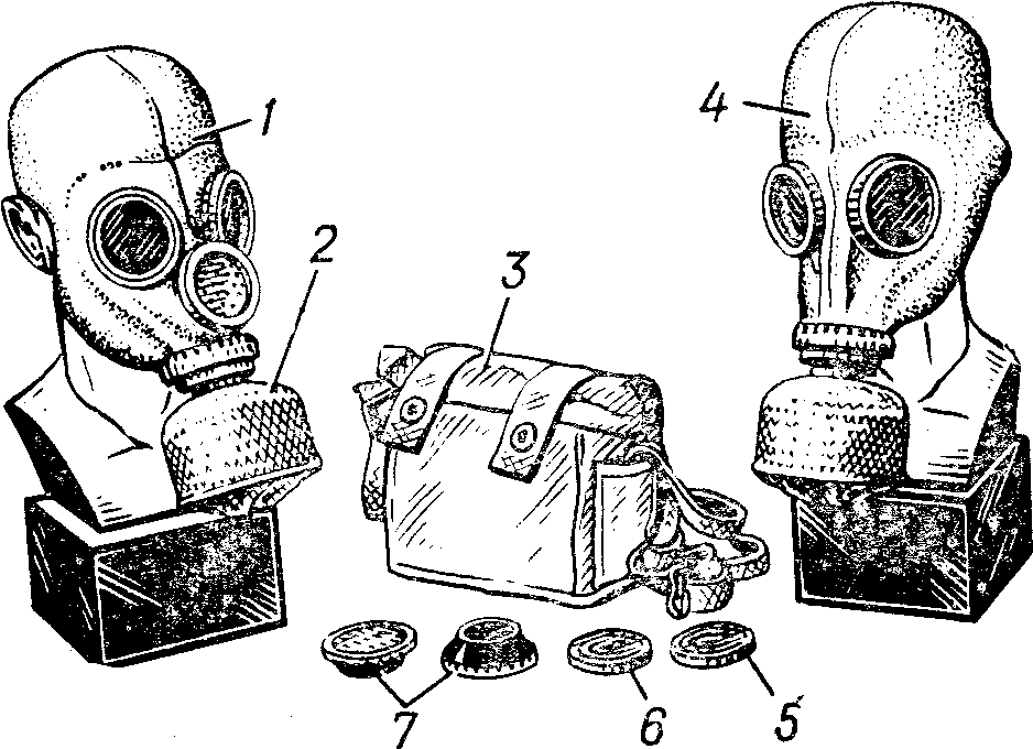 Рис. 1. Противогаз ПМГ-2: 1 – шлем-маска; 2 – фильтрующе-поглощающая коробка в чехле; 3 – сумка; 4 – шлем-маска; 5 – незапотевающие пленки; 6 – мембрана переговорного устройства; 7 – накладные утеплительные манжеты