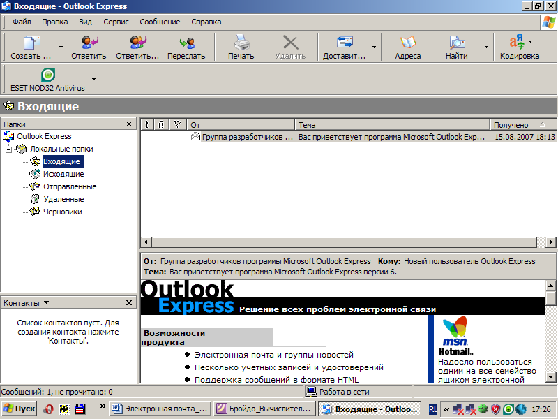 Прием сообщений и автономный просмотр. Это основная функция всех почтовых клиентов. При подключении к серверу РОР3 производится автоматическое копирование всех поступивших сообщений в базу данных почтового клиента, после чего их можно читать в автономном режиме (то есть, отключившись от Сети).