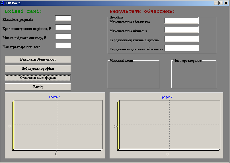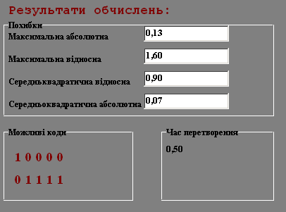 В результаті натискання даної кнопки виконуються обчислення похибок, генерація можливих кодів і обчислення часу перетворення для введених даних. Результати обчислень, як уже було зазначено вище, виводяться у відповідних полях: "Максимальна абсолютна", "Максимальна відносна", "Середньоквадратична відносна", "Середньоквадратична абсолютна", "Можливі коди" і "Час перетворення".