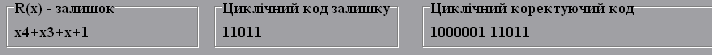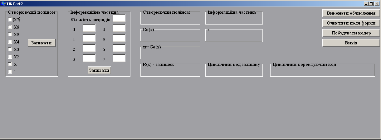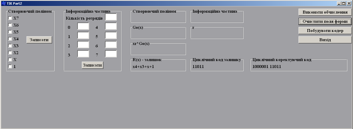 Наприклад, при введенні створюючого поліному і інформаційної частини таких, що були наведені в попередніх прикладах, після натискання кнопки "Виконати обчислення" матимемо у відповідних полях такі результати: