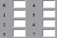 У вікнах пронумерованих від "0" до "7" вводиться задана в умові інформаційна частина, де "0"-"7" - номери відповідних розрядів інформаційної частини, починаючи з молодшого.