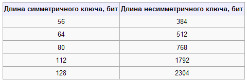 Несимметричные алгоритмы используют более длинные ключи, чем симметричные. Ниже приведена таблица, сопоставляющая длину ключа симметричного алгоритма с длиной ключа несимметричного алгоритма с аналогичной криптостойкостью (таб. 1.3).