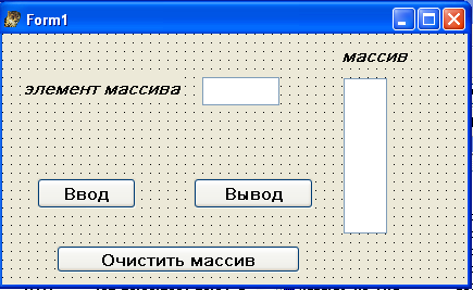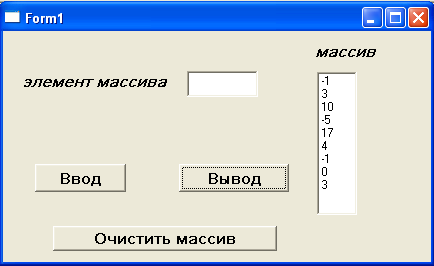 Это означает, что нажатие кнопки приводит к добавлению одного элемента из окна Edit в массив. При выполнении последующих действий по обработке массива значение переменной i определит количество элементов массива. Начальное значение i=0 можно задать в разделе описания типизированных констант или в методе OnCreate для формы (см. ниже) и сбрасывать его каждый раз при вводе нового массива. В массив запишется столько элементов, сколько раз будет нажата кнопка ввода. Если не сбрасывать значение i, то даже после обработки массива можно продолжить ввод элементов в массив.