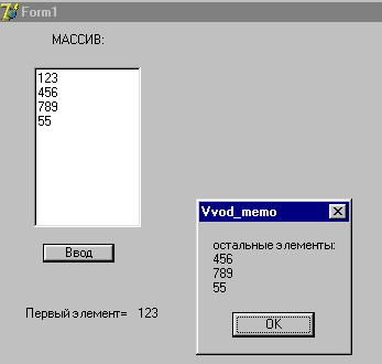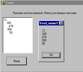 В отличие от строки ввода, текстовый редактор Memo может содержать любое количество строк. Его свойство text представляет собой строку, состоящую из находящихся в поле Memo строк, разделенных последовательностью символов с кодами 13 и 10 (конец строки и переход на новую строку). Эти символы добавляются в поле Memo при нажатии клавши Enter. Для выделения подстроки, содержащей элемент массива, нужно найти символ с кодом 13 (#13), скопировать в новую подстроку, а затем удалить ее вместе с кодами 13 и 10 и продолжить поиск конца строки.