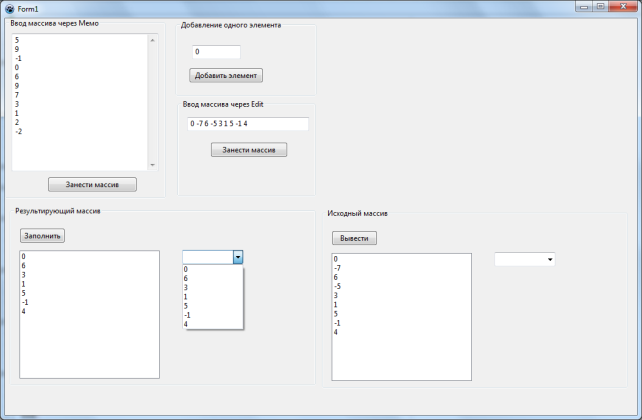 Вывод массива выполнить с помощью компонент ListBox и ComboBox. Выводить нужно как исходный массив, так и результирующий.