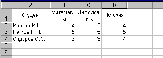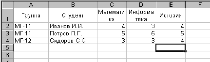 Пример 1. Найти средний балл каждого студента. Информация о результатах сдачи сессии представлена в списке рис.5. Решить эту задачу возможно только с помощью ввода расчетной формулы "средний балл".
