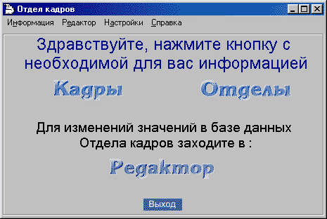 Автоматична система керування "Відділ кадрів" для ВАТ "Перетворювач" функціонує під керуванням операційної системи Windows 95/98/NТ/2000/XP. Для роботи з нею необхідно засобами Windows 95/98/NТ запустити програму "Отдел кадров" на виконання На екрані з'явиться головне вікно програми із заголовком система "Отдел кадров" (рисунок 2).