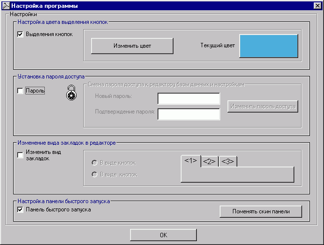 включати та виключати панель швидкого запуску, змінювати її скін - прапорець “Панель быстрого запуска”, кнопка “Поменять скин панели”.