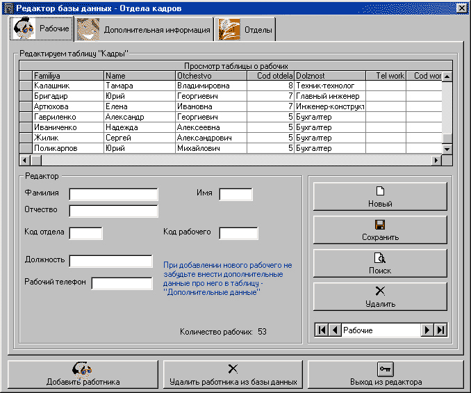 форма редактора (frmRedSostav) - надає можливість додавання, редагування та видалення записів працівників з бази даних;
