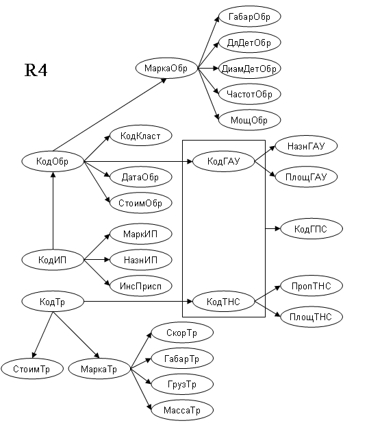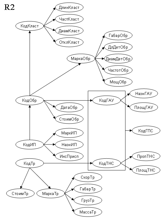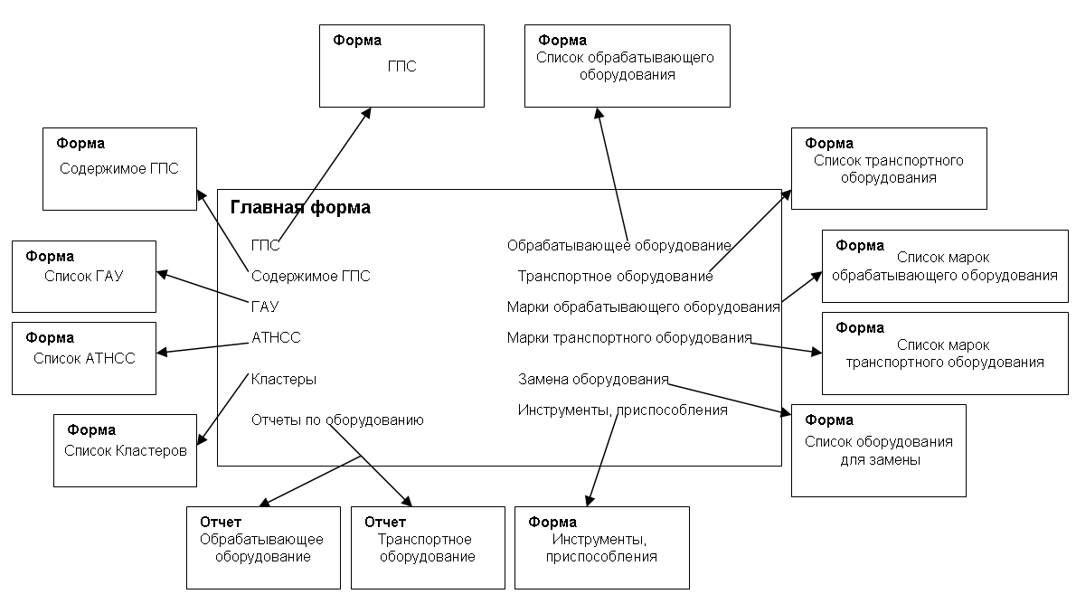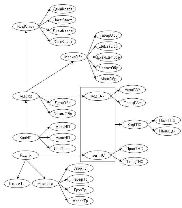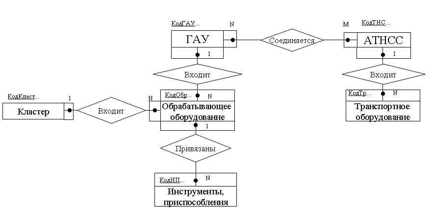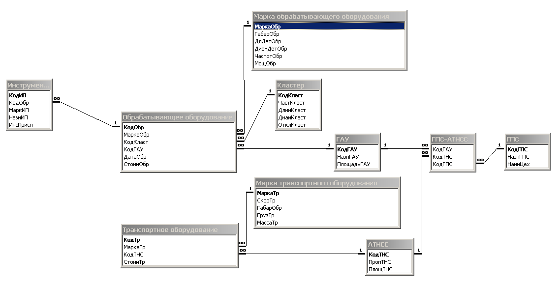 При построении модели базы данных за основу выбран набор нормализованных отношений, полученный в результате проектирования ER-методом. Модель представлена на рисунке ниже. Предполагается, что количество обрабатывающего и транспортного оборудования на предприятии не более 1000 ед. и 500 ед. соответсвенно. В базе данных будет хранится информация о 5000 обрабатывающих и 2000 транспортных оборудованиях. Число ГАУ будет равно 200, ГПС - 30, а АТНСС – 70. Число используемых инструментов/приспособлений – 10000. Предполагается, что число кластеров будет не более 10000.