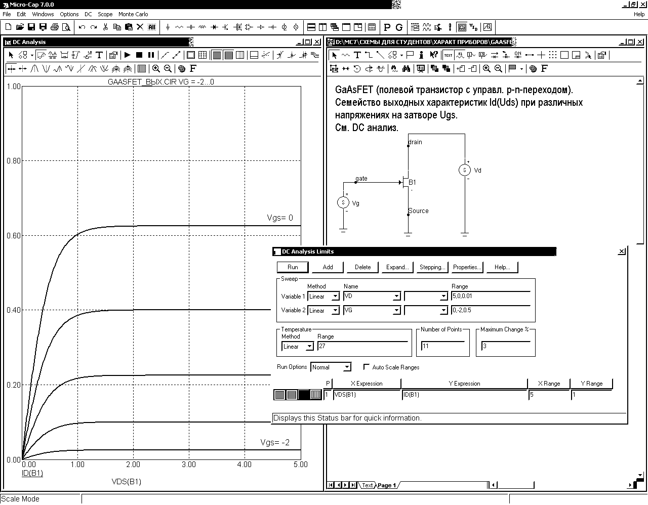 Расчет передаточных функций по постоянному току (DC —Alt+3) Арсенид-галлиевый полевой транзистор (GaAsFET)