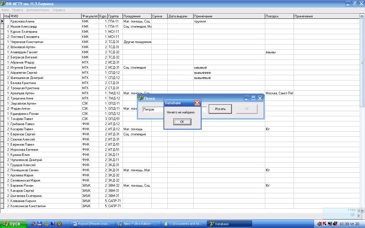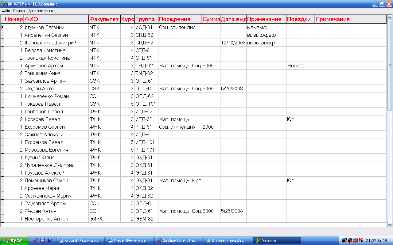 На рисунке 2 показано главное окно программы. В нём отображаются поля: “Номер”- номер студента по журналу, “ФИО”- фамилия, имя и отчество студента, ”Факультет”- шифр факультета на котором обучается данный студент, ”Курс” – номер курса на котором обучается студент, соответствующий году обучения студента в университете, “Группа”- шифр и номер группы обучающегося, “Поощрения”- различные поощрения, выдаваемые иногородним студентам, учащимся с тяжёлым материальным положением и так далее, “Сумма”- сумма выданного поощрения, “Дата выдачи”- число, месяц и год когда выдано поощрение, “Примечание”- любая дополнительная информация о выданном поощрении, “Поездки”- поездки от профкома студентов КФ МГТУ и “Примечания”- информация о поездке. Любые изменения, производимые в этом окне, будут сохранены автоматически, но только тогда, когда курсор после необходимых изменений будет переставлен на любую другую ячейку.