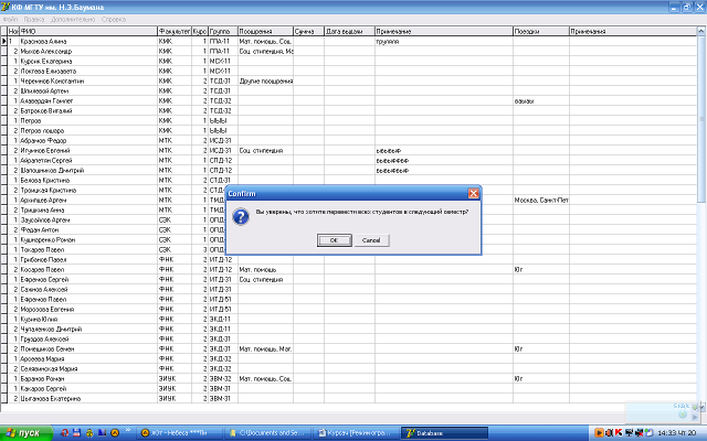 Для перевода студентов в следующий семестр, необходимо нажать “Дополнительно”- “Перевести в следующий семестр”. В появившемся окне (рис. ) для подтверждения нажмите “ОК”. Если при этом увеличивается значение поля “Курс”, то записи, значение этого поля которых равнялось 6, удалятся из базы данных и переместятся в файл с расширением *.csv. Находиться он будет в папке с базой данных, а откроется в Microsoft Office Excel.