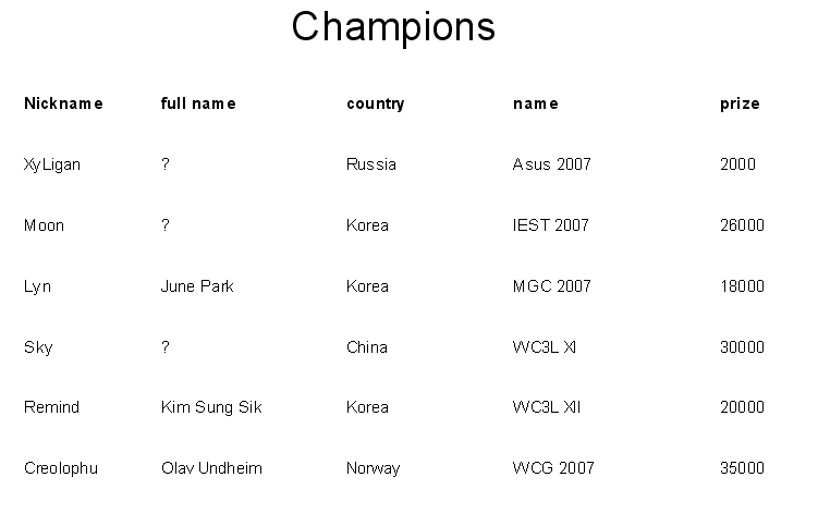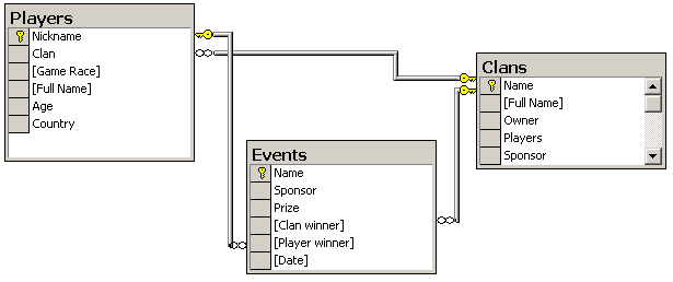 Players (NickName, Clan, Game Race, Full Name, Age, Country).