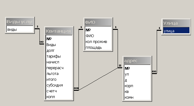 Связь осуществляется по равенству значений в полях связи. Например связь между таблицами Вид услуги и Данные по видам услуг осуществляется по полю Счетчик. Это поле является внешним ключом в таблице Квитанция.