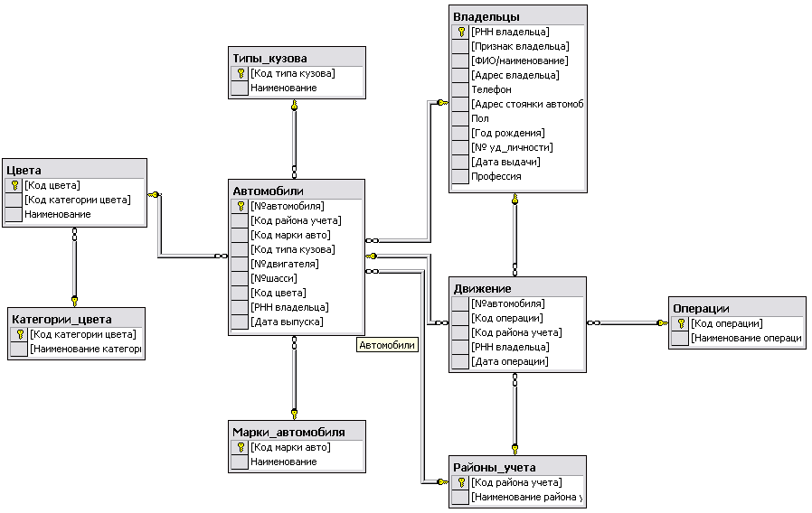 Автомобили (№ автомобиля, код района учета, код марки автомобиля, код типа кузова, № двигателя, № шасси, код цвета, РНН владельца, дата выпуска);