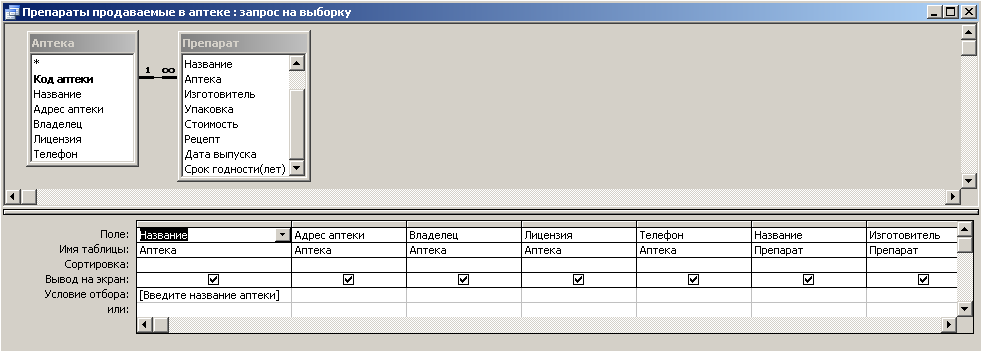 Рис. 13. Параметрический запрос для определения препаратов в заданной аптеке