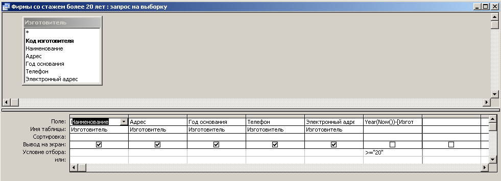 Рис. 17. Запрос на выборку фирмы со стажем более 20 лет
