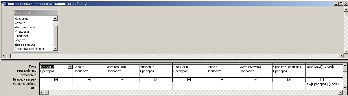 Рис. 19. Запрос на выборку о просроченных препаратах