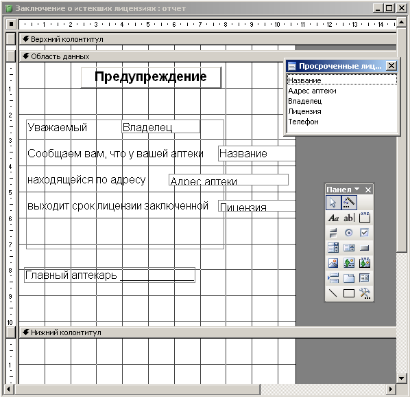 В качестве примера создадим отчет о просроченных лицензиях. Используем для этого конструктор отчетов и используем результаты запроса «Просроченные лицензии». Экранная форма конструктора отчетов приведена на рис. 20, а сам Отчет для контрольного примера – в приложении.